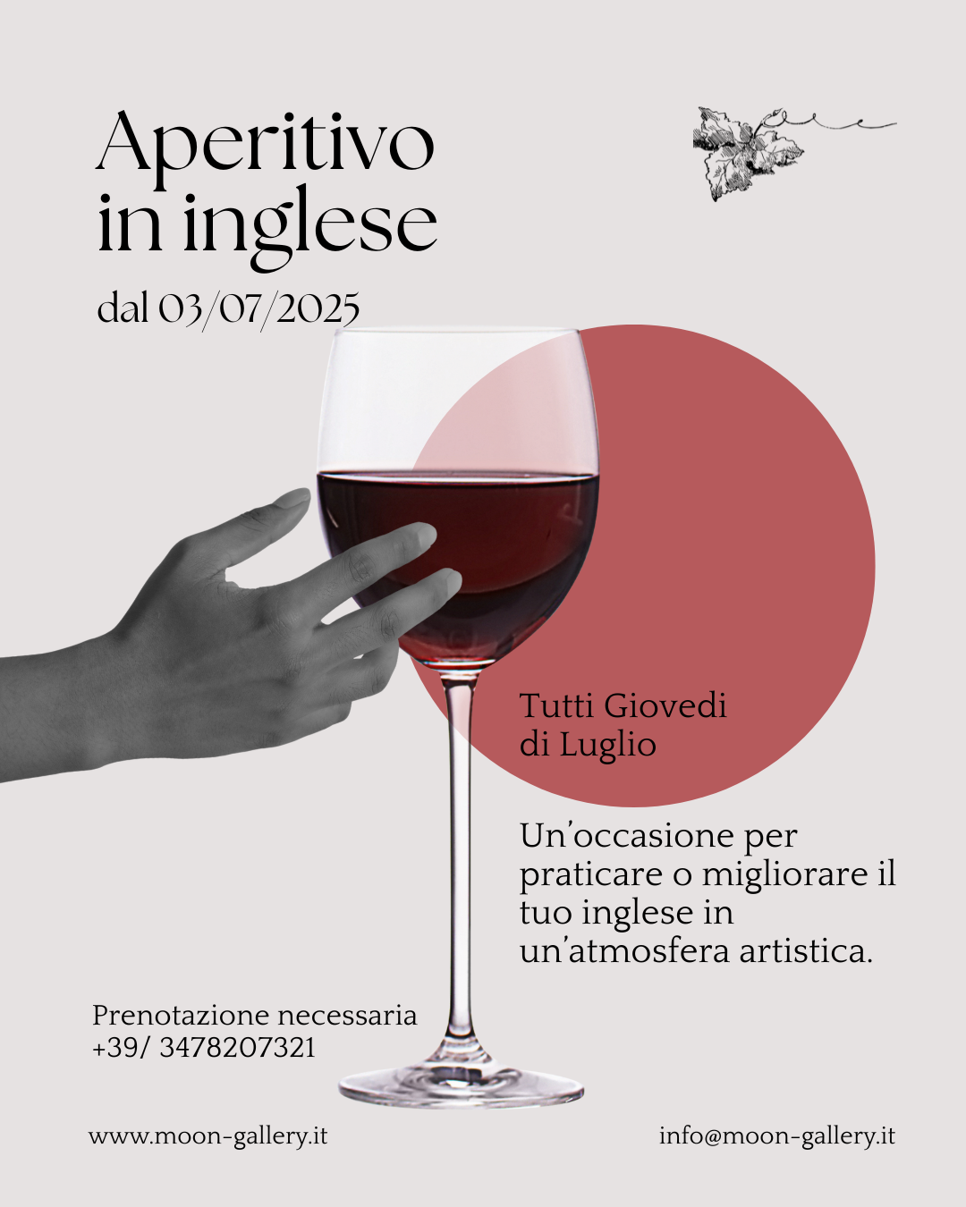 Ogni giovedì di luglio, dalle 18:30 alle 21:00, la Moon Gallery apre le porte del suo lounge bar per un aperitivo speciale… in inglese! Ogni incontro sarà esclusivamente incentrato sul dialogo, con argomenti scelti dai partecipanti in base ai loro interessi e necessità. Che si tratti di terminologia lavorativa, viaggi, arte, cultura o società, costruiremo insieme un percorso di conversazione su misura. Alla fine di ogni sessione, verranno forniti esercizi pratici per rafforzare quanto appreso.